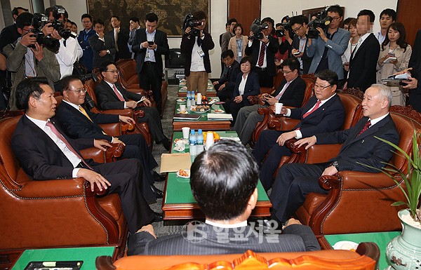 서상기 정보위원장을 비롯한 여야 의원들과 남재준 국가정보원장이 8일 오후 서울 여의도 국회에서 열릴 정보위원회 전체회의를 앞두고 위원장실에서 대화를 하고 있다. 이날 정보위회 회의에서 여당 위원들은 'NLL 회의록'의 진위 여부를 가리기 위해서는 국정원에 보관 중인 것으로 알려진 2007년 남북정상회담 회의록 녹취 파일을 공개해야 한다는 입장인 반면, 야당 위원들은 'NLL 회의록' 녹취 파일 공개 불가 입장을 밝히고, 남재준 국정원장이 지난 6월 'NLL 회의록'을 임의로 공개한 경위에 대해서도 집중 추궁할 예정이다.