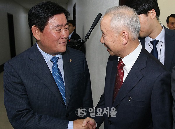 남재준 국가정보원장이 8일 오후 서울 여의도 국회에서 열릴 정보위원회 전체회의를 앞두고 최경환 새누리당 원내대표와 인사하고 있다. 이날 정보위회 회의에서 여당 위원들은 'NLL 회의록'의 진위 여부를 가리기 위해서는 국정원에 보관 중인 것으로 알려진 2007년 남북정상회담 회의록 녹취 파일을 공개해야 한다는 입장인 반면, 야당 위원들은 'NLL 회의록' 녹취 파일 공개 불가 입장을 밝히고, 남재준 국정원장이 지난 6월 'NLL 회의록'을 임의로 공개한 경위에 대해서도 집중 추궁할 예정이다.