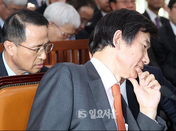 박근혜 정부 첫 국정감사가 시작된 14일 오전 국회 외교통일위원회 국정감사에서 윤병세 외교부 장관이 외교부 관계자와 대화를 나누고 있다.