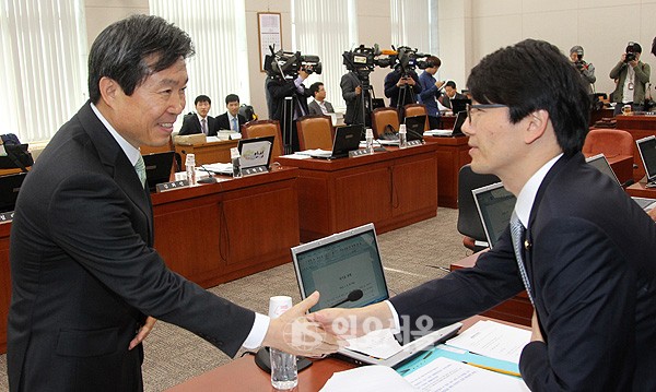 제정부 법체처장이 22일 오전 국회에서 열린 법제사법위원회 국정감사에서 정의당 서기호 의원과 인사를 나누고 있다. 정대웅 기자 photo@ilyoseoul.co.kr 정대웅 기자 photo@ilyoseoul.co.kr 저작권자 © 일요서울i 무단전재 및 재배포 금지 정대웅 기자 다른기사 보기