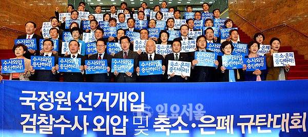 민주당 김한길 대표와 전병헌 원내대표를 비롯한 당 지도부 및 의원들이 22일 오전 국회 로텐더홀 계단에서 국정원 선거개입 검찰수사 외압 및 축소 은폐를 규탄하고 있다. 정대웅 기자 photo@ilyoseoul.co.kr 정대웅 기자 photo@ilyoseoul.co.kr 저작권자 © 일요서울i 무단전재 및 재배포 금지 정대웅 기자 다른기사 보기