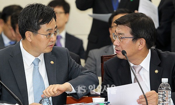 김동연 국무조정실장이 31일 국회에서 열린 정무위원회 국정감사에서 이호영 국무총리 비서실장과 대화를 나누고 있다.