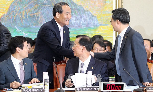 박승춘 국가보훈처장이 31일 국회에서 열린 정무위원회 국정감사에서 김동연 국무조정실장 등 국무위원들과 인사하고 있다.