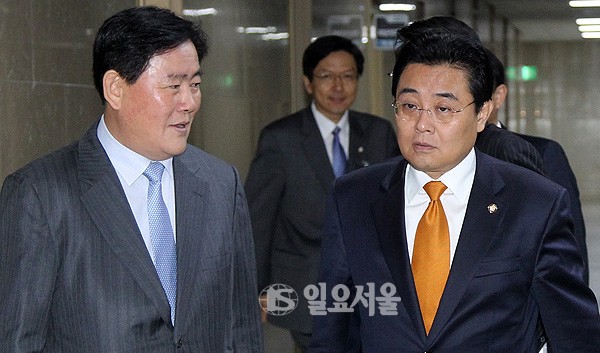 새누리당 최경환 원내대표와 민주당 전병헌 원내대표가 6일 오전 국회에서 열린 운영위원회 전체회의에 참석하기 위해 들어가고 있다.