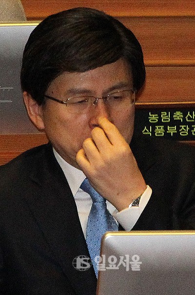 황교안 법무부 장관이 19일 오전 국회 본회의장에서 열린 정치분야 대정부질문에서 회의 시작을 기다리고 있다.