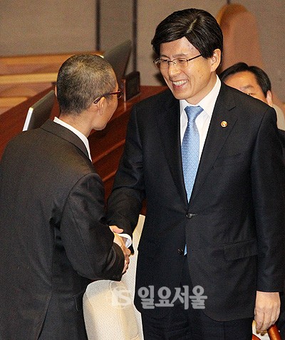 황교안 법무부 장관이 19일 오전 국회 본회의장에서 열린 정치분야 대정부질문에서 통진당 이상규 의원과 인사하고 있다.