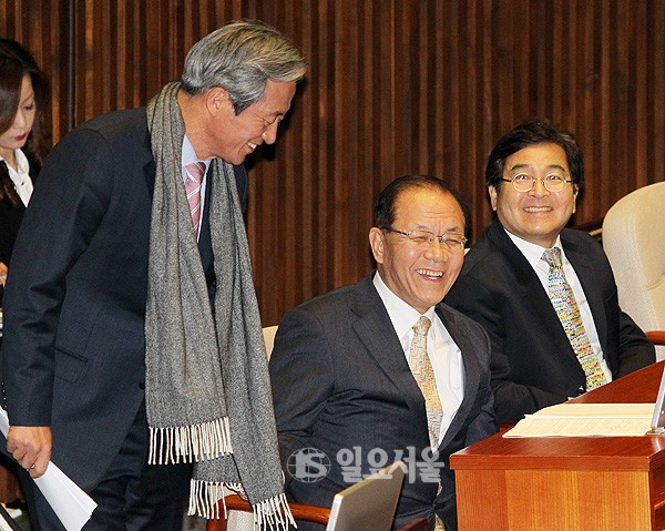 20일 국회 본회의장에서 열린 외교-통일-안보분야 대정부질문에서 새누리당 황우여 대표와 정몽준 의원이 환하게 웃으며 인사를 하고 있다.