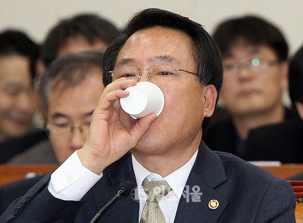 방하남 고용노동부 장관이 27일 국회에서 열린 환경노동위원회 전체회의에서 물을 마시고 있다.
