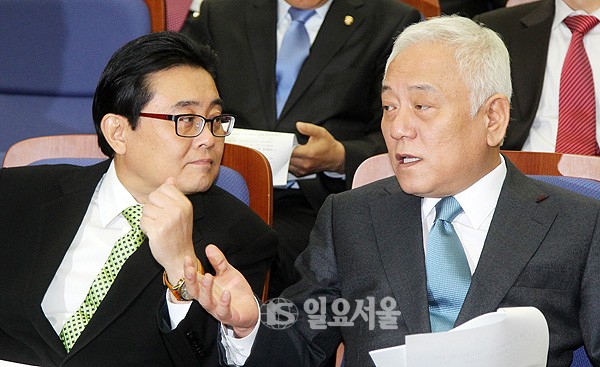 2일 국회에서 열린 민주당 정책 의원총회에서 김한길 대표와 전병헌 원내대표가 대화를 나누고 있다.