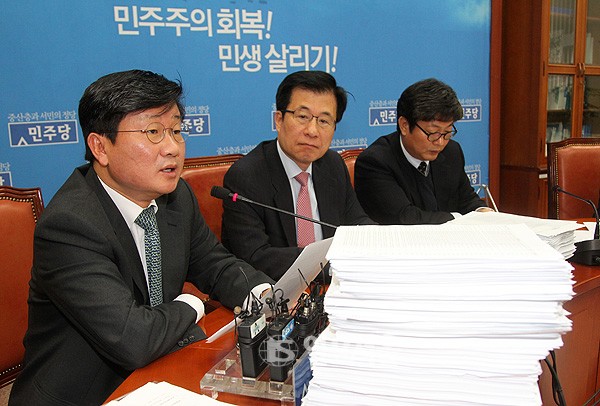 국회 법사위 소속 야당 의원들이 4일 오전 국회에서 기자회견을 열고 국정원 직원들이 유포한 121만여건의 정치ㆍ대선 관련 트윗글 분석 결과를 공개하고 있다. 야당 의원들은 "국정원이 ‘봇(bot)’, ‘트위터피드(TwitterFeed)’, ‘트윗 덱(TweetDeck)’ 등 자동 전송 프로그램을 통해 직원들이 직접 작성한 글이나 보수논객의 블로그, 트윗글을 트위터 등을 통해 조직적으로 퍼날랐다"고 주장했다.