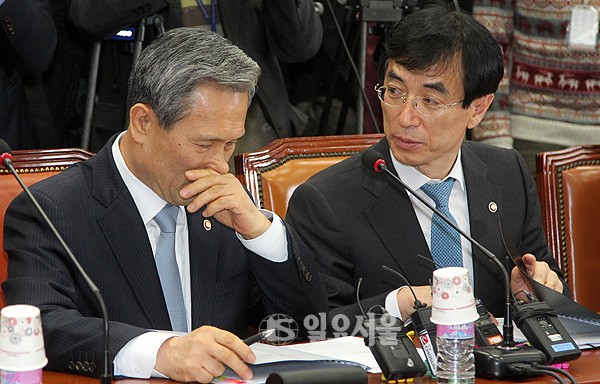 4일 국회에서 열린 새누리당 최고중진연석회의에 현안보고를 위해 참석한 김관진 장관이 황우여 대표 등과 대화를 나누고 있다.