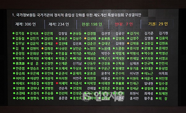 5일 오후 열린 국회 본회의에서 국가정보원 등 국가기관의 정치적 중립성 강화를 위한 제도개선 특별위원회 구성 결의안이 통과되고 있다.