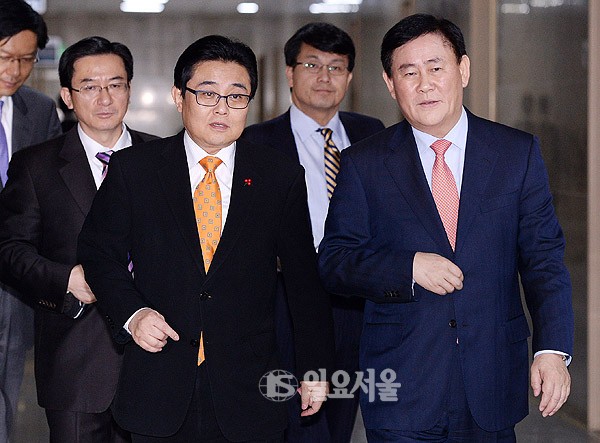 국회 운영위원장인 최경환 새누리당 원내대표와 전병헌 민주당 원내대표가 5일 국회에서 열린 운영위원회 전체회의에서 국정원 개혁특별위원회와 정치개혁특별위원회 구성안을 의결하기 위해 나란히 회의장으로 입장하고 있다. 정대웅 기자 photo@ilyoseoul.co.kr 정대웅 기자 photo@ilyoseoul.co.kr 저작권자 © 일요서울i 무단전재 및 재배포 금지 정대웅 기자 다른기사 보기