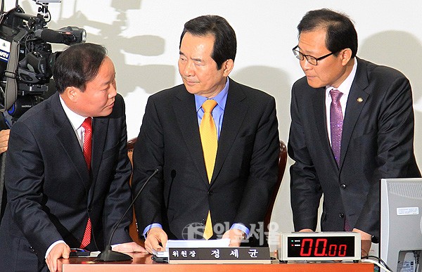 12일 국회에서 열린 국정원 개혁특위 전체회의에서 정세균 위원장과 새누리당 김재원 간사, 민주당 문병호 간사가 대화를 나누고 있다.