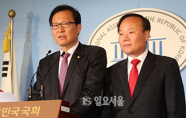 국정원 개혁특위 김재원 새누리당 간사와 문병호 민주당 간사가 12일 국회 정론관에서 국정원이 자체 개혁안 내용을 발표하고 있다.