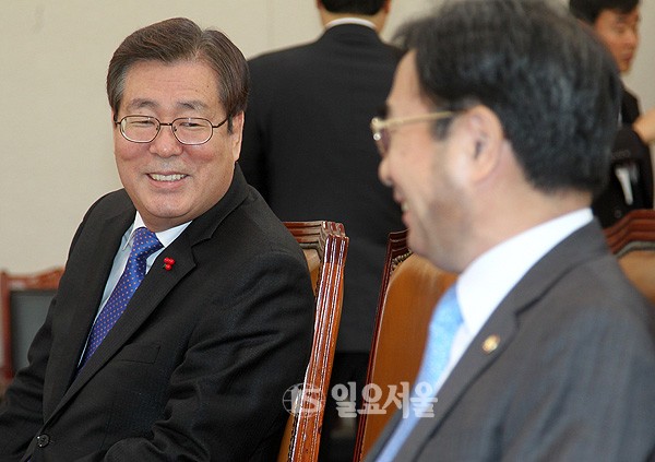황찬현 감사원장이 18일 오전 열린 국회 법제사법위원회 전체회의에 출석해 차한성 법원행정처장과 대화를 나누고 있다.