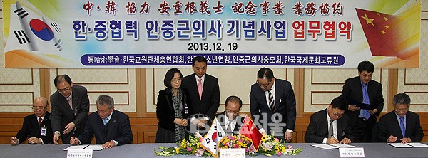 19일 오전 국회 귀빈식당에서 열린 '한-중 협력 안중근 의사 기념사업 업무협약식'에서 참석자들이 협약서에 서명을 하고 있다. 왼쪽부터 안응모 안중근의사숭모회 이사장, 안양옥 한국교원단체총연합회 회장, 황우여 새누리당 대표 겸 한국청소년연맹 총재, 한 팡밍 중국 차하얼 학회 주석, 송기출 한국국제교류문화원 대표. 정대웅 기자 photo@ilyoseoul.co.kr 정대웅 기자 photo@ilyoseoul.co.kr 저작권자 © 일요서울i 무단전재 및 재배포 금지 정대웅 기자 다른기사 보기