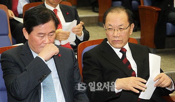 19일 오후 국회에서 열린 새누리당 의원총회에서 황우여 대표와 최경환 원내대표가 대화를 나누고 있다.