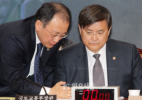 서승환 국토교통부 장관이 26일 국회에서 열린 국토교통위원회 전체회의에서 박기풍 차관과 대화를 나누고 있다.