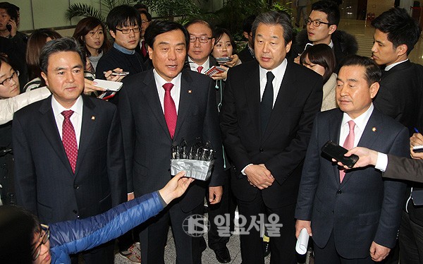 30일 국회 정론관에서 '철도파업사태 해결 관련 여야 기자회견'을 갖기위해 새누리당 김태흠, 김무성 의원, 민주당 박기춘 사무총장, 이윤석 국토위 간사가 회견장에 들어서고 있다.