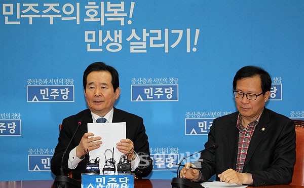 국회 국정원 개혁특위 정세균 위원장과 민주당 문병호 간사가 2일 국회 원내대표실에서 국가정보원 개혁 입법 관련 기자간담회를 갖고 있다.