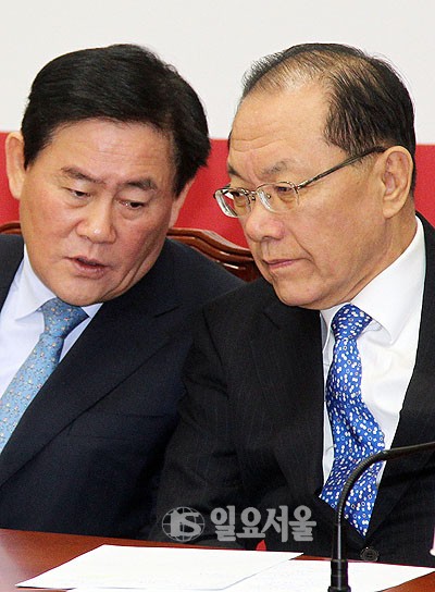 8일 오전 국회에서 열린 새누리당 최고중진연석회의에서 서청원 의원과 이재오 의원이 개헌을 두고 이견을 보인 가운데 황우여 대표와 최경환 원내대표가 대화를 나누고 있다.