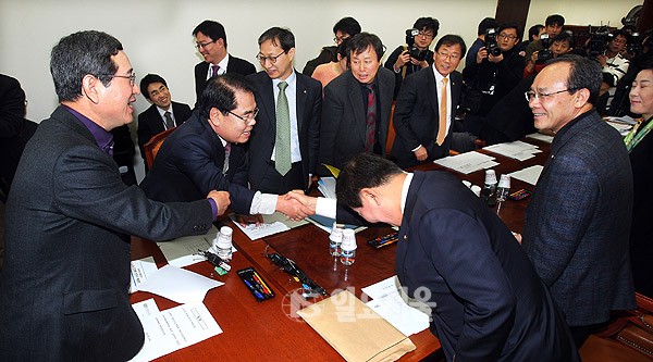 9일 오전 국회에서 '시·도 교육감 선거 등 지방교육자치 선거제도에 대한 개선 방안'을 논의하기 위해 모인 여-야 정개특위 위원들이 웃으며 인사하고 있다.