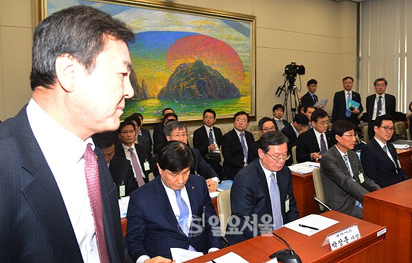 23일 오후 카드사 개인정보유출 사태와 관련해 열린 국회 정무위원회 전체회의에서 신제윤 금융위원장이 회의장에 들어서고 있다. 오른쪽부터 심재오 KB국민카드 사장, 이신형 NH농협카드 사장, 박상훈 롯데카드 사장, 김상득 KCB사장, 신제윤 금융위원장.
