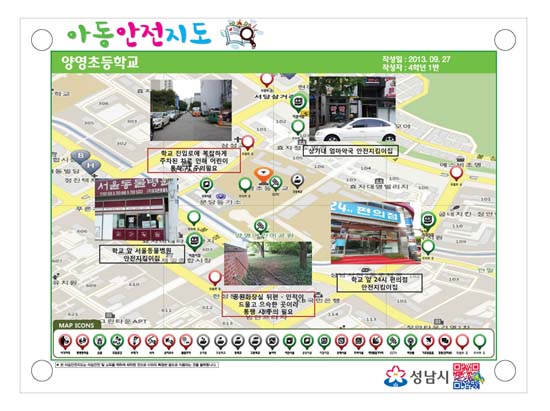 [일요서울 | 수도권 김대운 기자] 성남시는 아동 성폭력 예방을 위해 학교 근처 성범죄 취약지역과 안전시설 등을 표시한 아동안전지도(가로60㎝*세로45㎝)를 66개 초등학교별로 제작해 20일 배포했다.