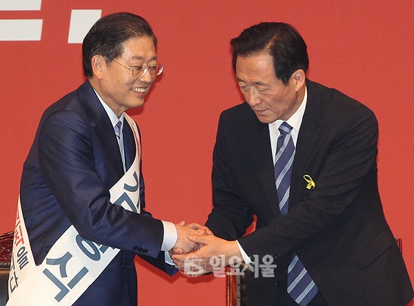 12일 오후 서울 방이동 올림픽공원 체조경기장에서 열린 2014 전국동시지방선거 새누리당 서울시장 후보자 선출대회에서 서울시장 후보로 선출된 정몽준 후보가 김황식 후보와 인사하고 있다.