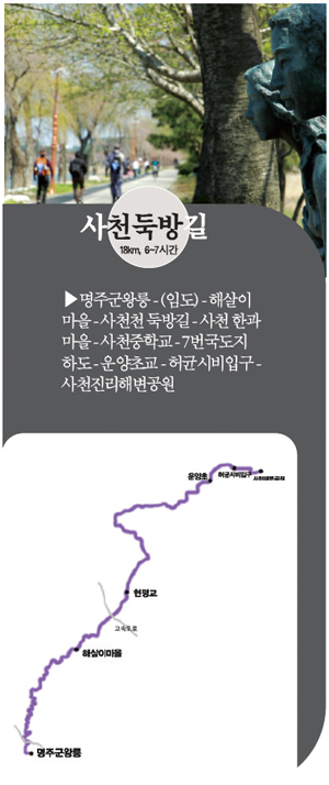 사천둑방길 시작은 명주군왕릉이다. 명주군왕 김주원은 통일 신라의 왕이 될 뻔했으나 홍수로 제때 왕궁에 갈 수 없다는 이유 하나로 옹립이 취소됐다. 이후 후환이 두려워 강릉 어귀까지 도피했다가 이 지역의 지배자가 돼 ‘강릉 김씨’의 시조가 됐다.