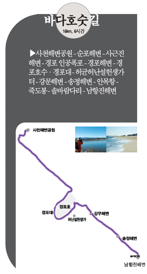 하지만 바다호수길의 가장큰 매력은 17㎞ 코스 안에 있는 해송 숲이다. 방풍림 역할을 하기 위해 조성 됐지만 보기만 해도 시원하다. 딱 걷기 좋을 정도로만 폭신한 흙길로 화려하지는 않지만 하늘 높이 쭉쭉 솟은 해송은 보기만 해도 힘이 솟는 느낌이다.