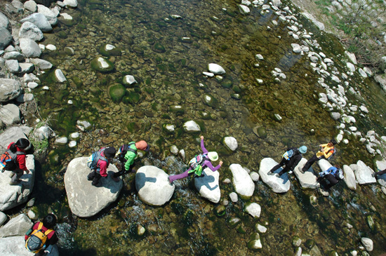하지만 사천천 근처에는 넓은 논이 있다. 무농해 농법으로 재배하는 이 경작지에는 두루미들이 무리지어 미꾸라지를 노린다. 이곳에서 나는 쌀은 청정쌀로 유명하다. 아직 덜 자란 논에는 물 반 벼 반이다.