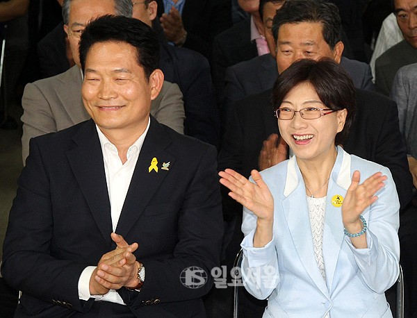 송영길 새정치민주연합 인천시장 후보가 6.4 지방선거 투표일인 4일 오후 인천 남구 도화동 선거캠프 상황실에서 부인 남영신씨와 개표방송을 지켜보며 대화하고 있다.