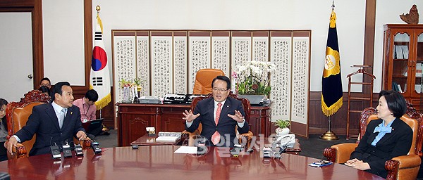 정의화 국회의장(가운데)과 이완구 새누리당 원내대표(왼쪽), 박영선 새정치민주연합 원내대표가 12일 오후 여의도 국회 의장실에서 회동을 갖고 대화하고 있다.