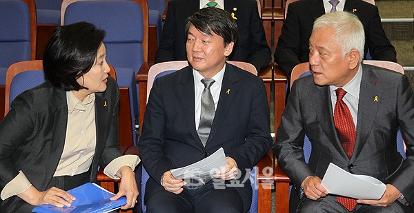 김한길, 안철수 새정치연합 공동대표가 24일 오후 국회에서 열린 의원총회에서 박영선 원내대표와 대화를 나누고 있다.