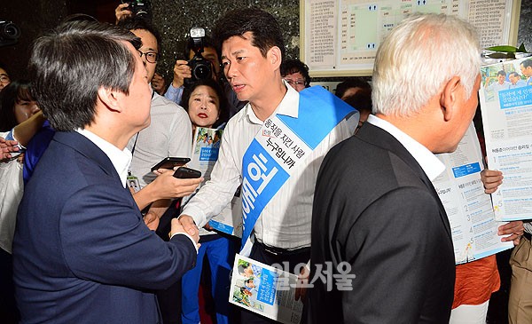 7일 오전 국회에서 열린 새정치민주연합 최고위원회의에서 김한길, 안철수 공동대표가 허동준 동작을 지역위원장과 인사하고 있다.