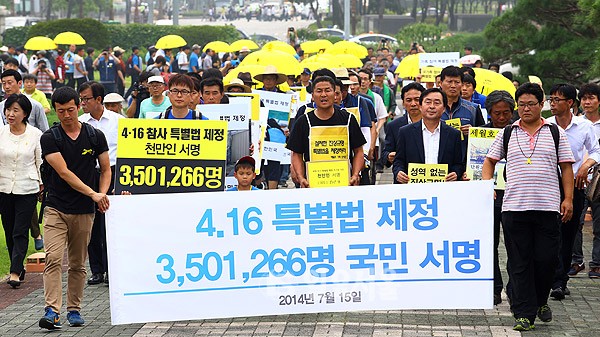세월호 참사 91일째인 15일 오전 세월호 가족과 각계시민들이 서울 여의도 공원에서 기자회견을 마친 뒤 350만1266명의 서명이 담긴 416개 박스를 국회의장에게 전달하기 위해 국회로 행진하고 있다.