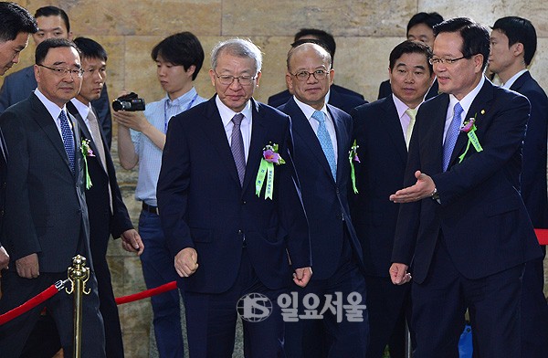 17일 오전 국회 본청에서 열린 제66주년 제헌절 경축식에서 정의화 국회의장이 정홍원 국무총리, 양승태 대법원장 등에게 자리를 안내하고 있다.